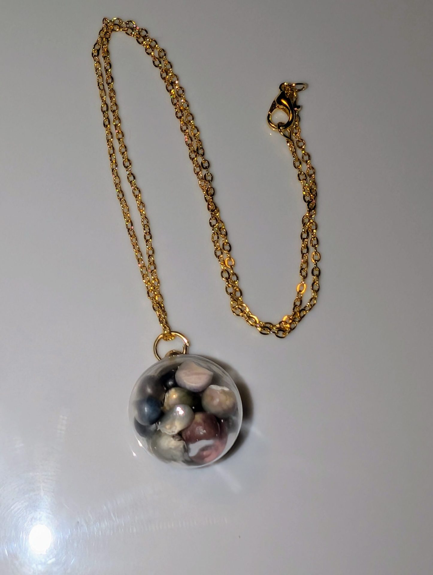 - Chaîne argentée élégante : La chaîne en dorée met en valeur le pendentif en verre, ajoutant une touche de modernité et de raffinement.